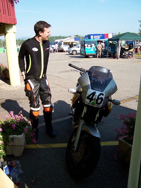 Auf dem nachfolgenden Foto sieht man mich beim Anziehen des vorgeschriebenen Rückenprotektors neben meiner Maschine. Auf dem silberfarbenen Panzer-Tape kann man zwei weitere Aufkleber erkennen: In schwarz auf weißem Grund die von mir gewählte Startnummer und einen kleinen, runden und grünen Aufkleber, der meine Gruppenzugehörigkeit demonstrierte. Beim Anmelden im Internet konnte man sich eine Startnummer reservieren lassen. Da ich eigentlich keine Präferenzen hatte, hab ich einfach mal eine naheliegende Nummer ausgewählt. Die von meinem Namensvetter Valentino Rossi, die Nummer 46. Und die war tatsächlich noch frei!