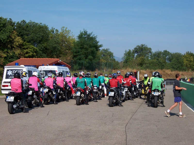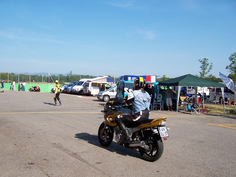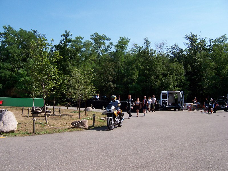 An der Einfahrt zum Sperrbereich angekommen gibt es einen kleinen Rückstau von der Phon-Messung. Ja, eigentlich sollten alle Maschinen bei 60% der Maximaldrehzahl weniger als 98dB auf dem Meßgerät vorweisen können oder sie werden 'disqualifiziert', sprich dürfen nicht am Renntraining teilnehmen. Man kann die Mitglieder der verschiedenen Intruktorengruppen schön an ihren verschiedenfarbigen Shirts erkennen.