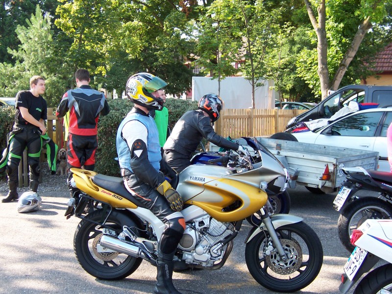 Nach meiner schnellen Rückkehr zu meiner Frau und meiner Maschine demontierten wir dann mit Hilfe des Piloten vom Vorabend die Spiegel und fingen an alle Lichter mit dem Tape abzukleben. Dies war obligatorisch und sollte verhindern, daß bei einem Sturz kleinsplittrige Trümmerteile die Strecke verunreinigten und zur Gefahr für die anderen Teilnehmer werden. Die Spiegel waren sowieso nur sturzexponiert und ihre Funktion eher gefährlich, da - wie mir mehrfach erklärt wurde - sich der Pilot ausschließlich auf sich selbst konzentrieren soll. Meint ein anderer Pilot schneller zu sein und überholen zu müssen, ist dies sein Problem. Außerdem war in den Instruktorengruppen das Überholen sowieso untersagt.