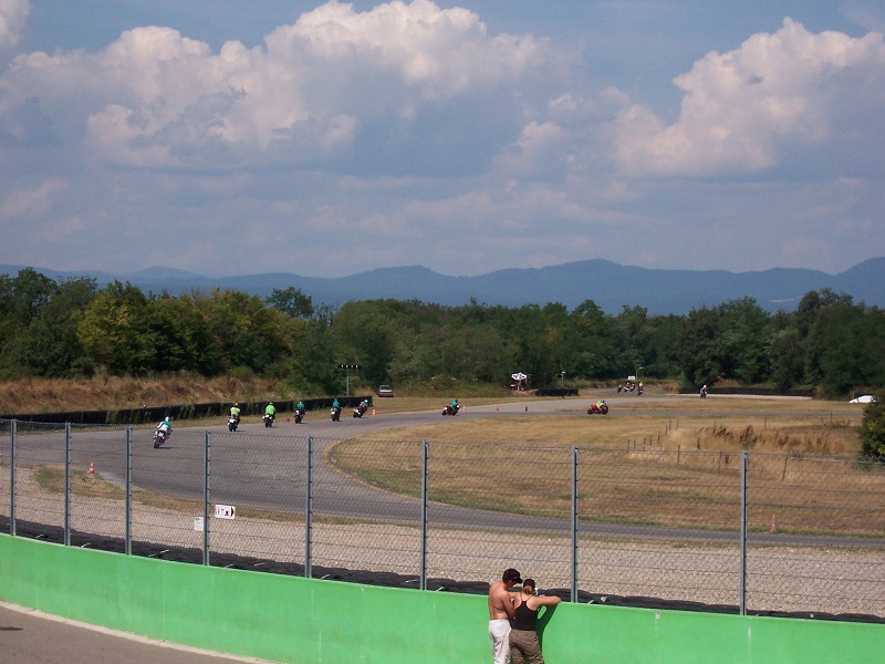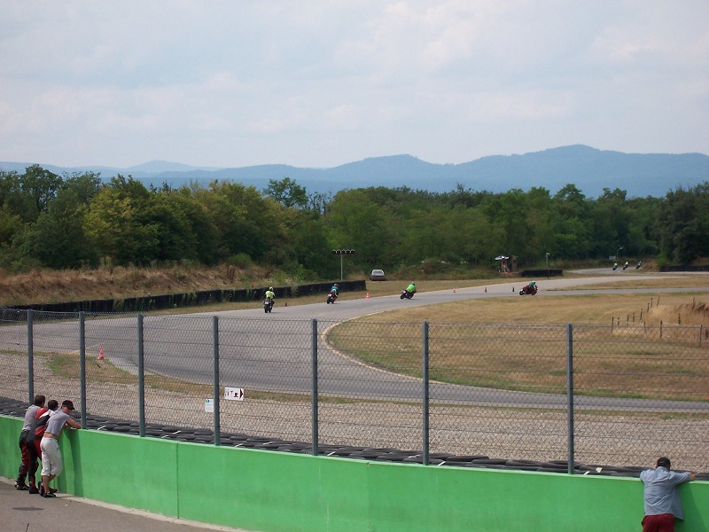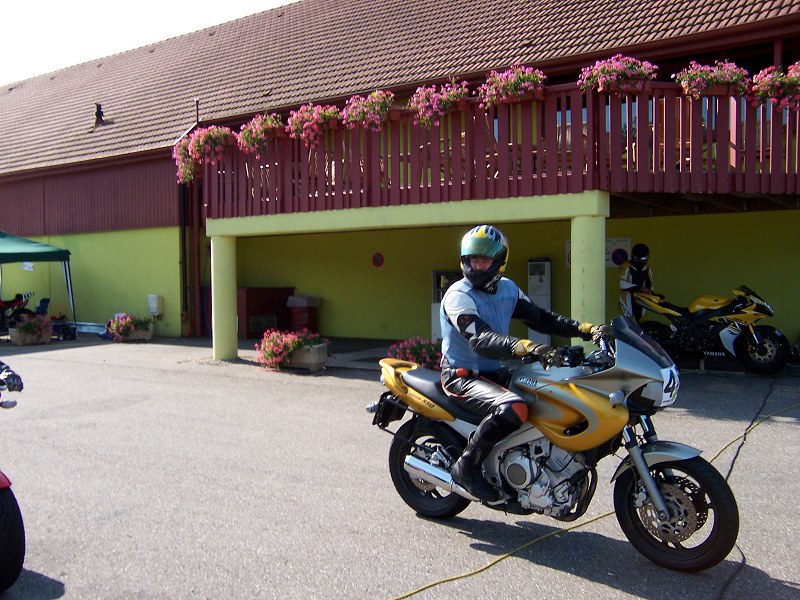 Direkt nach dem vorletzten Turn für diesen Tag wurde dieses Bild aufgenommen. Ich habe meine Frau auf der Terasse gesehen und schaue deshalb direkt in die Kamera. Dieser Turn mußte leider auch einmal wegen unserer Gruppe abgebrochen werden, da einem Piloten beim Herausbeschleunigen aus der Rechtskurve nach der Streckeneinfahrt das Hinterrad weggerutscht ist (übrigens nur zwei Maschinen vor mir). Dem Piloten ist zum Glück nichts passiert und seine rote Trixie (Yamaha TRX-850, der gleiche Motor, wie in meiner Maschine) hatte nur geringfügigen Schaden (Handbremshebel abgebrochen, BOS-Auspuff etwas zum Rad hin gebogen und an der Schelle auch zerkratzt, Verkleidung gebrochen und zerkratzt), den die Leute an der Strecke reparieren konnten, so daß er noch damit nach Hause fahen konnte.