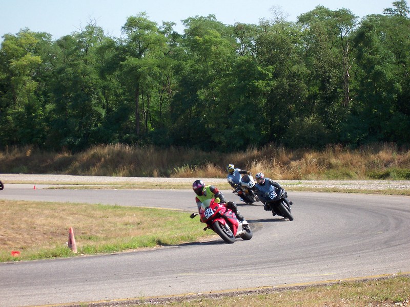 Die nächsten beiden Bilder zeigen mich innerhalb meiner Gruppe in der langen Rechtskurve zwischen Streckenaus- und -einfahrt. Nur hier konnte meine Frau nah genug an die Strecke heran, um gute Fotos zu schießen. Die wechselnde Position erklärt sich dadurch, daß nach Möglichkeit nach jeder Runde der Pilot hinter dem Instruktor (der fährt immer vorneweg, so daß kein Pilot den Bremspunkt verpassen sollte) ans Ende des Feldes wechselt. Ausgelöst wurde diese Rochade durch ein Zeichen des Instruktors meist auf der langen Geraden.