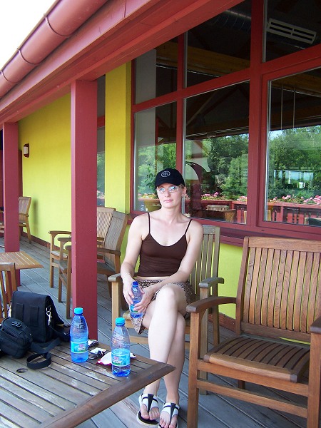 Auf diesem Foto sieht man meine Frau in ihrem Sonnenbad-Outfit (sie wollte nicht, daß ich dieses Bild zeige, aber ich finde, sie sieht gut darauf aus! Naja, als Ausgleich sei hier ein Bild aus unserer privaten Sammlung.) auf der Terasse über der Tankstelle. Auf dem Kopf hat sie meine Yamaha-Schirmmütze, wobei man bei der verkleinerten Version dieses Bildes wahrscheinlich das Logo nicht erkennen kann.