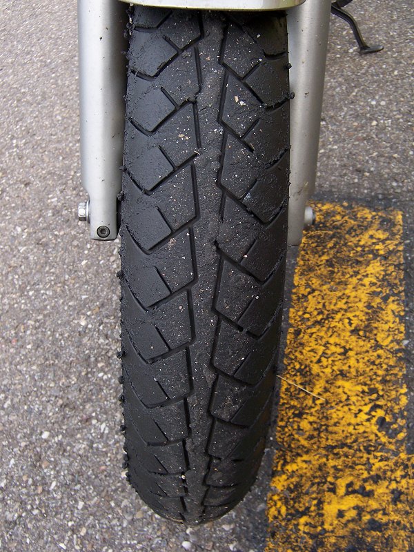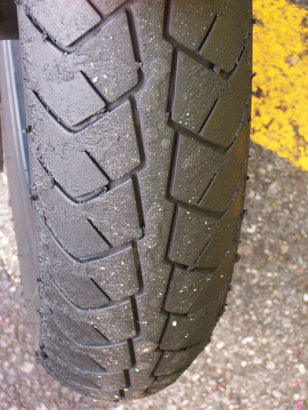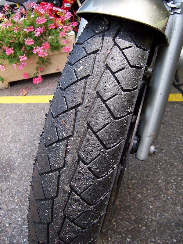 Zum Abschluß noch ein Blick auf den Endzustand des Vorderradreifens. Deutlich zu sehen: die Blasen. Außerdem: vor allem auf der linken Seite des Reifens sammelte sich der Reifenabrieb. Dieser hing übrigens noch nach unserer Heimfahrt durch den Schwarzwald dran.
