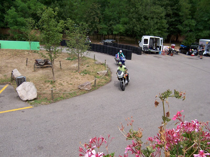 Die Rückkehr von meinem ersten Turn. Im Hintergrund kann man links das grüne Zelt des Piloten vom Vorabend und das Heck seiner R6 darunter sehen, während auf der rechten Bildseite die Tankstelle zwischen den zwei Säulen unterhalb der Veranda sichtbar ist.