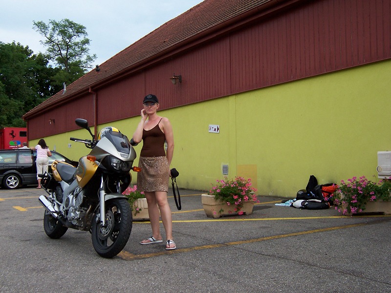 Das Bild zeigt meine Frau neben meiner Maschine. Wieder mit Spiegeln und ohne Aufkleber. Dank meiner Frau kamen wir auch recht schnell weg, da sie fast die ganze 'Downstrip-Aktion' allein gemacht hat.