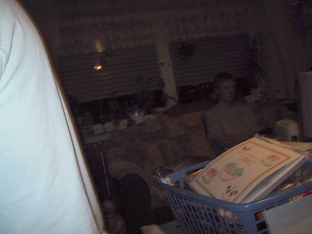 Pizza im Korb. Im Hintergrund kann man noch Voodoo über seiner Mahlzeit meditieren sehen. |