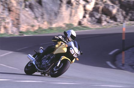 Bike: Wie gut meine aktuellen Fahrwerkseinstellung sind, merkt man daran, daß ich mir ernsthaft Gedanken über einen neuen Fußrastensatz (höher) gemacht habe. Bis mir einfiel, daß die Fußrasten eigentlich die letzte Instanz vor der Amputation der Auspuffanlage sind. Es nervt aber halt schon ein wenig, daß ich mir ständig selber den Gang rauskicke, wenn die Straße meinen linken Fuß nach oben drückt... Besonders, wenn man eine gelbe TL1000 im Nacken hängen hat...
